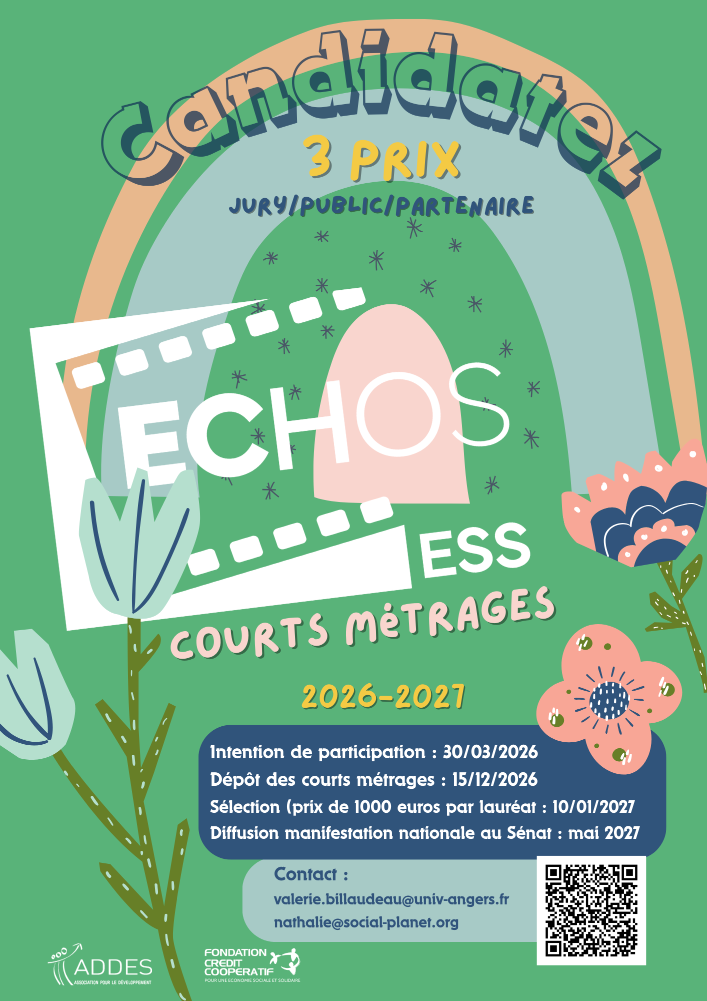 Les courts métrages sélectionnés seront diffusés lors d’une journée dédiée à la coopération et aux transitions dans l’ESS au cours des Echos de l’ESS au printemps 2027 au Sénat. Trois d’entre eux seront choisis et valorisés par un prix de 1000 euros chacun (prix du public, prix des partenaires et prix de l’ADDES) grâce à notre partenariat avec la Fondation du Crédit Coopératif.